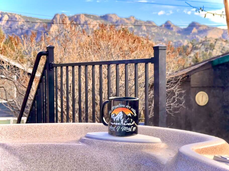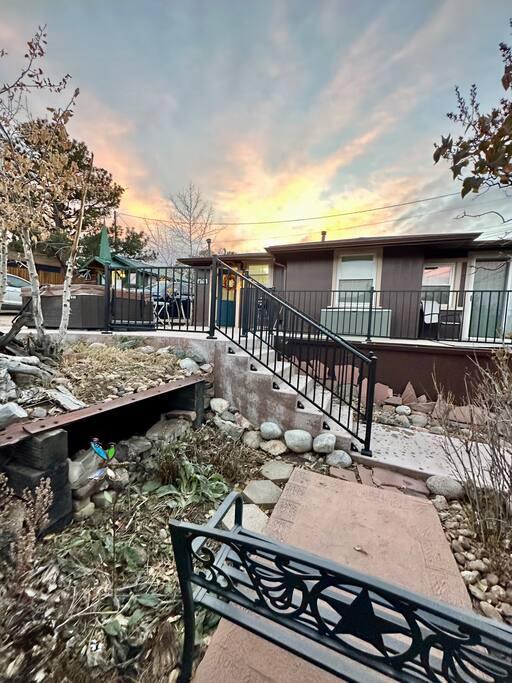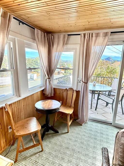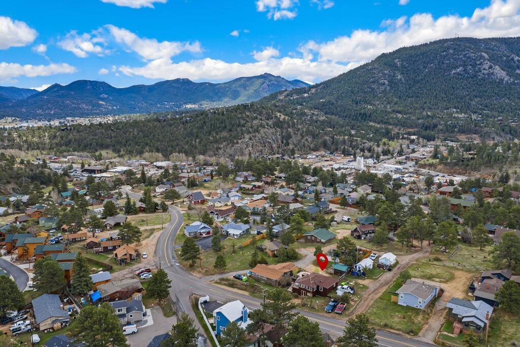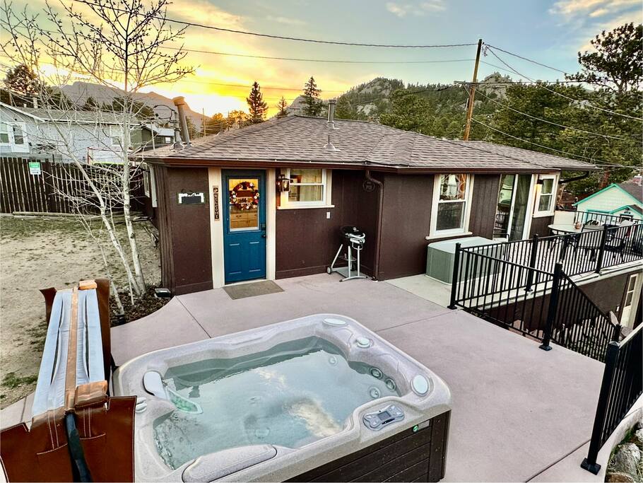 Lovingly renewed 100-year-old historic downtown cabin with mountain views, private hot tub, gas fireplace, AC, W/D, & seasonal stream feature. 5 min walk to town or 5 min drive to RMNP.